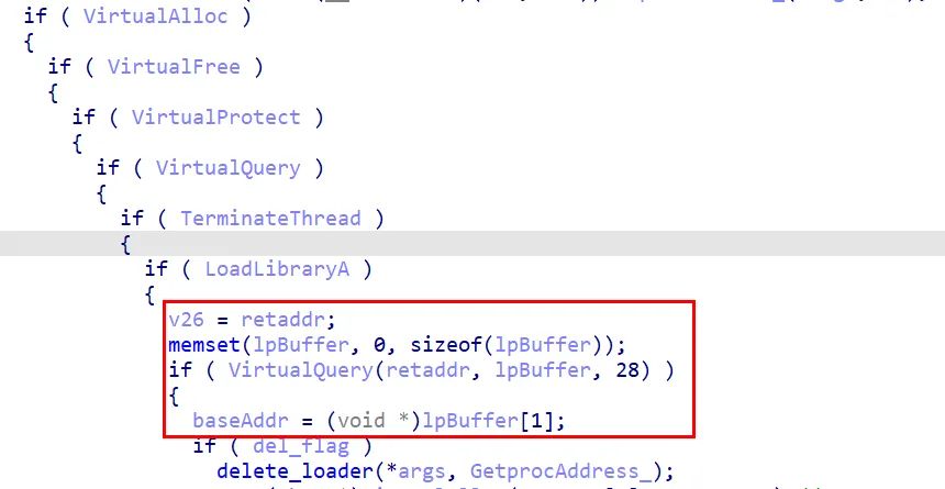 VirtualAlloc, VirtualFree, VirtualProtect, TerminateThread, LoadLibrayA 함수들의 주소를 정상적으로 구했다면 VirtualQuery() 를 호출한다.
