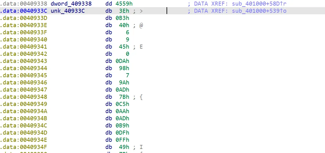 unk_40933c 주소를 저장하고 for문을 돌면서 할당받은 memory 영역에 특정 연산을 거친 값이 저장되는데 이는 .data 영역에 들어있는 값을 0x4559와 xor 등의 연산을 통해 계산된 결과 값이다.