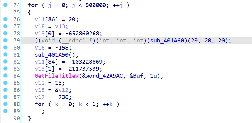 메인함수 초반부분을 보면 여러 동작을 하는데 별 의미없는 로직이 많다. 또한 위 그림과 같이 50만번 루프를 도는 로직을 볼 수 가 있는데 이 역시 의미없는 로직이다. 단지 분석가들의 분석 시간을 딜레이 시키는 역할로 보면 된다.