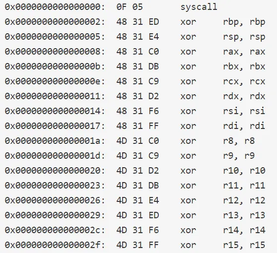 char result[100] = "\x0F\x05\x48\x31\xED\x48\x31\xE4\x48\x31\xC0\x48\x31\xDB\x48\x31\xC9\x48\x31\xD2\x48\x31\xF6\x48\x31\xFF\x4D\x31\xC0\x4D\x31\xC9\x4D\x31\xD2\x4D\x31\xDB\x4D\x31\xE4\x4D\x31\xED\x4D\x31\xF6\x4D\x31\xFF";