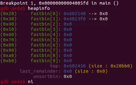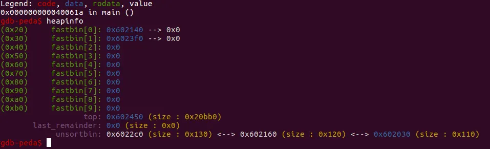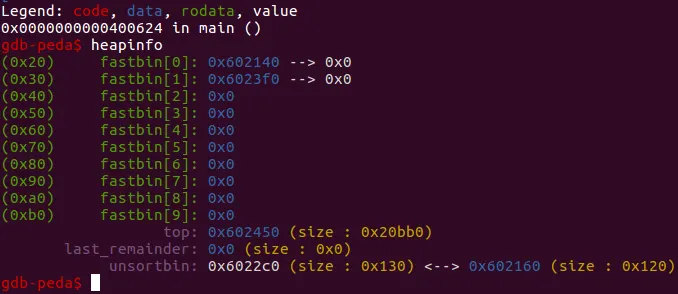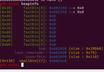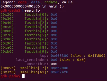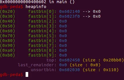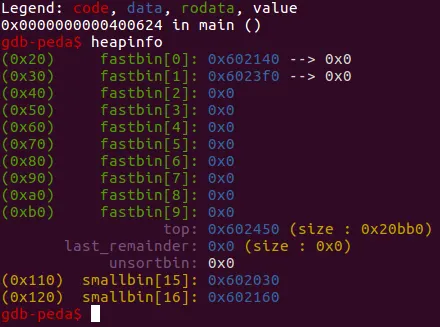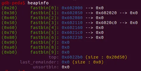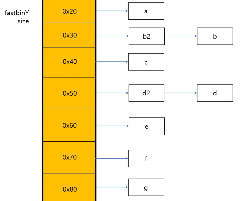 (참고로 fastbin의 경우 0x20 ~ 0xb0 크기의 청크들을 총 10개로 관리한다고 하는데 실제로는 0x20부터 0x80까지 총 7개만 fastbin으로 관리되는것 같다. ) → fastbin 사이즈를 임의로 변경하지 않는이상..