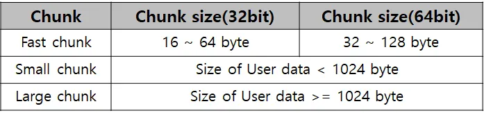 할당된 청크는 청크 사이즈의 크기에 따라서 다음과 같이 구분된다.