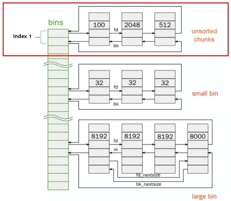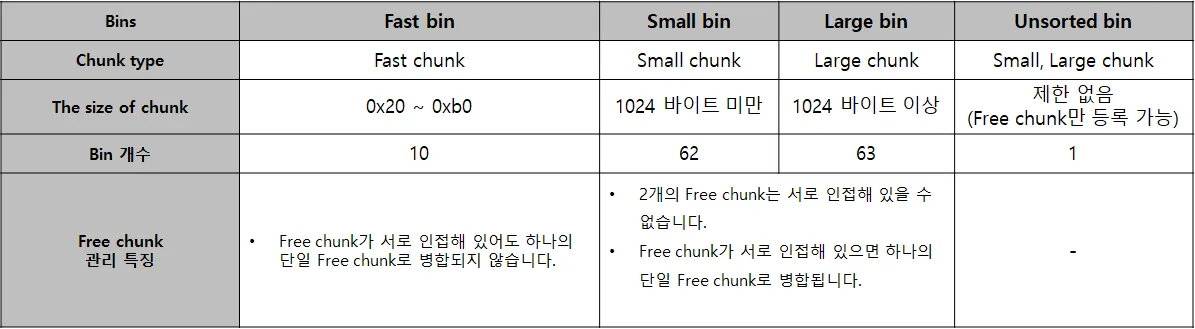 Bins : 총 127개의 빈중 제일 처음 빈은 특별한 용도(Unsorted bin)으로 사용되고 나머지 126개가 unsorted bin, small bin, large bin으로 사용된다.