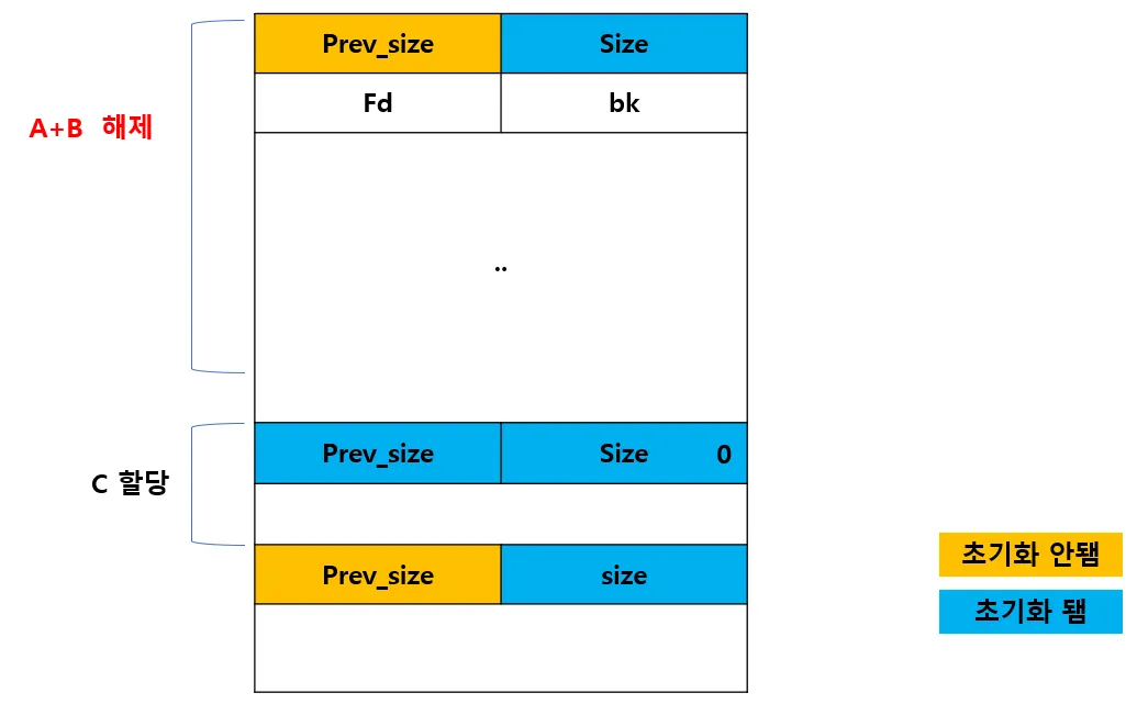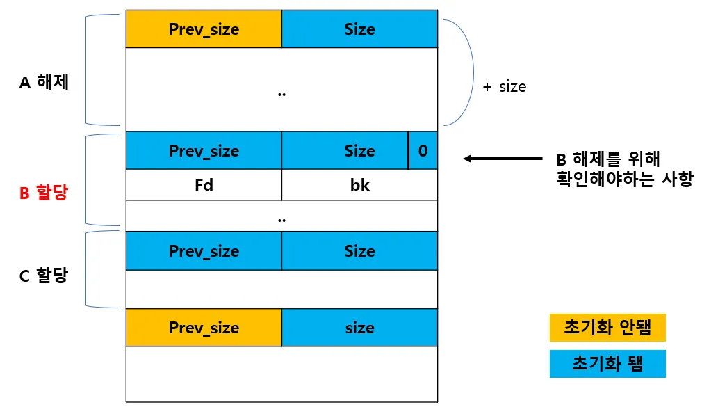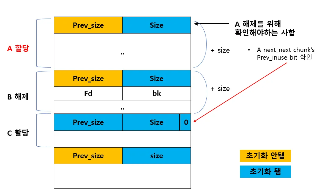 A를 해제하려고 할 때 다음 청크 B가 해제되어있기 때문에 병합이 이루어진다. B의 할당 or 해제 여부는 C의 prev_inuse 비트로 판단하기 때문에 A주소에서 size+size로 C의 p flag를 확인하여 병합을 진행한다.