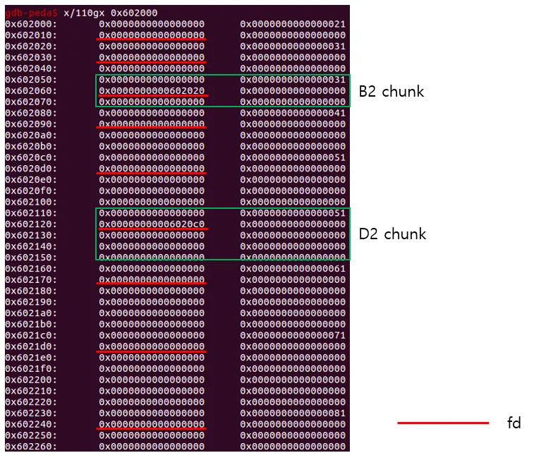 총 10번의 malloc 호출을 하고 전부다 free를 하는 단순한 코드이다. fastbin이 관리하는 0x20 ~ 0x80 사이즈를 확인하기 위해 사이즈별로 동적할당을 진행하였다. 또한 단일연결 리스트로 구성되는 걸 확인하기 위해 b2와 d2를 추가적으로 삽입하였다.