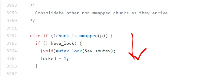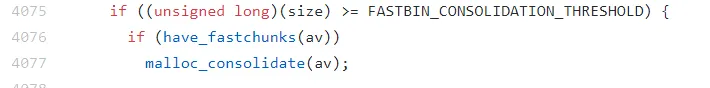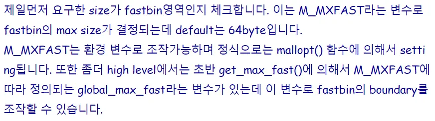 병합을 진행하여 bins list들을 관리한다. 하지만 fastbins의 특징 자체가 작은 크기의 청크들을 관리하기