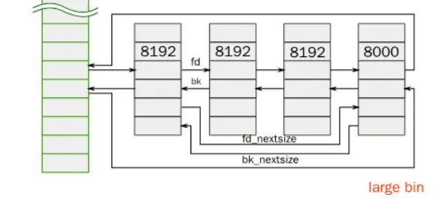 large bin은 0x400 이상의 청크가 저장되는 bin으로써, 메모리 할당과 반환의 속도가 fastbin, unsorted bin, small bin 중에서 가장 느리다. bin의 개수는 63개이며 large bin은 다른 bin들과 다르게 각 인덱스에 연결되어 있는 청크들의 사이즈가 동일하지 않다. large bin의 특징을 살펴보자.