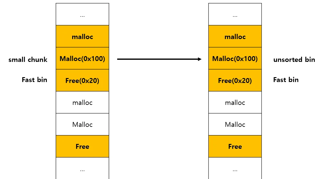 fast bin의 경우 free chunk가 서로 인접해 있어도 하나의 free chunk로 병합되지 않는다