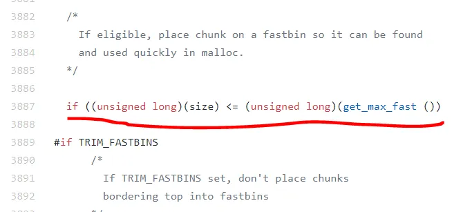 또한 fast bin 을 제외하고 모든 bin(small, unsorted)들은 top 청크 바로 이전 청크가 해제된 경우, top 청크와 병합하는데, 병합된 top 청크가 m_trim_threshold라는 내부적인 특정 임계값 보다 커졌다면, top 청크를 축소한다
