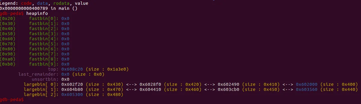 현재 largebin[0]에 0x400부터 0x430 까지의 사이즈를 가진 청크가 들어가 있다. 또한 정렬이되어 맨 왼쪽이 가장 큰 사이즈를 갖는다.