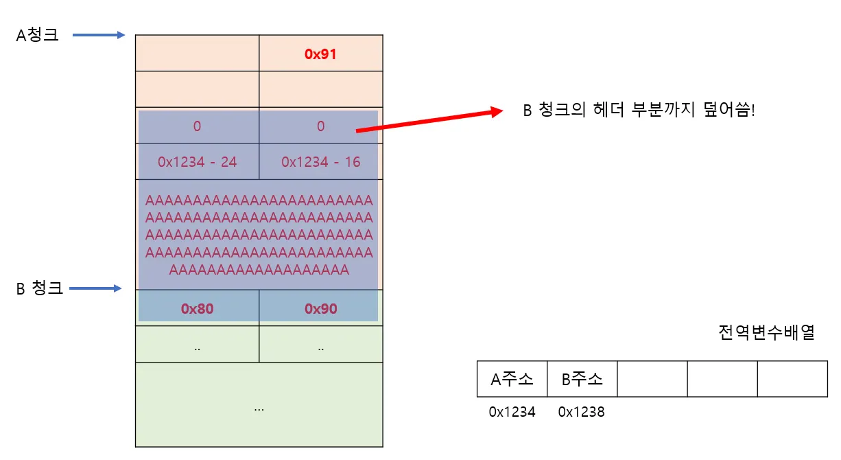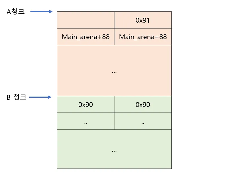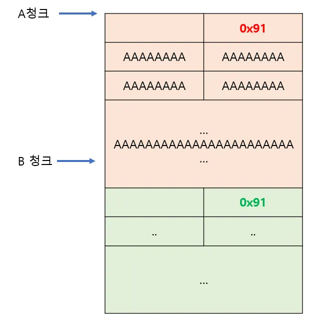 A청크의 데이터를 수정하여 B 청크의 헤더가 조작됨
