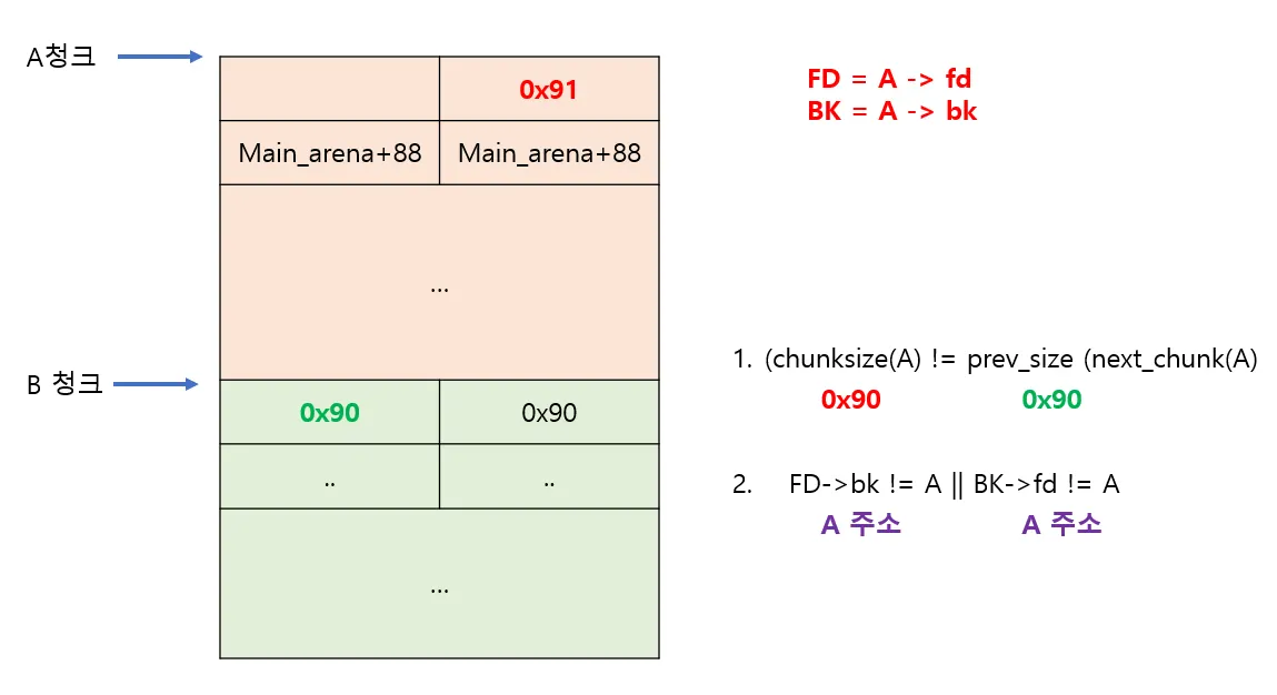 B를 free 시키면 현재 A가 free된 상태이기 때문에 unlink가 호출될 것이고 이때 인자로 A의 주소가 들어갈 것이다. 첫번째 조건문으로 사이즈를 체크하는데 정상적인 unlink이므로, 0x90으로 동일하여 첫번째 조건문을 통과할 것이다