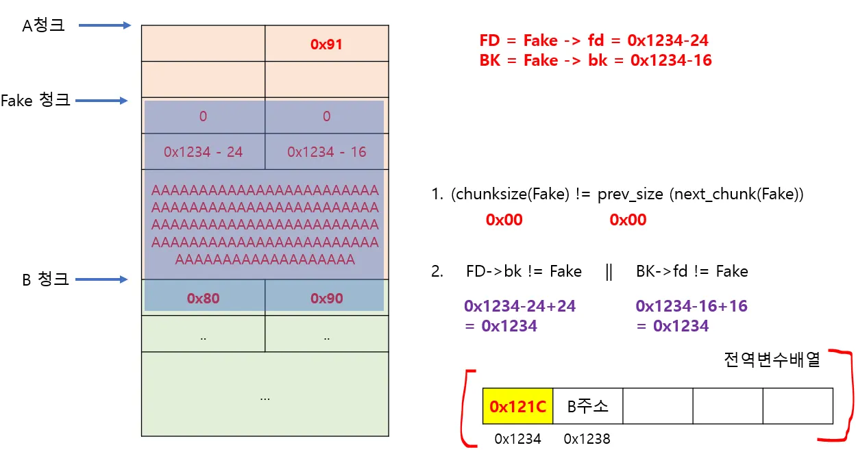 이러한 환경이 갖춰진다면, Unsafe Unlink를 이용하여 원하는 공간에 원하는 값을 쓸수가 있다.