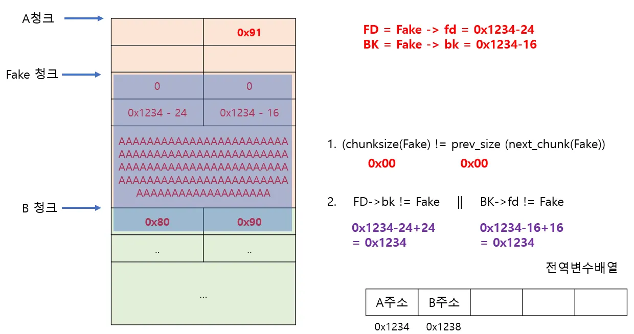 똑같이 계산되어 Bk → fd 역시 Fake 청크를 가리키고 있어 두번째 조건문도 만족한다. 이렇게 두개의 조건을 모두 만족하기 때문에 아래 로직이 수행된다