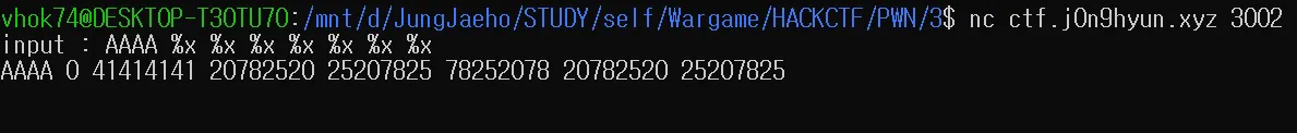 아까 사진을 다시 보자. "AAAA %x %x %x %x %x %x %x" 이렇게 입력하면, AAAA 0 41414141 ...~~ 이렇게 나오는 것을 확인 할 수 있다.