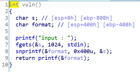 메인에는 별 다른 내용이 없다. 하지만 vuln() 함수가 있어서 해당 부분을 확인해 보았다. snprintf와 printf 함수에서 서식문자를 지정해주지 않고 format 변수에 바로 때려박는 것을 확인 할 수 있다.