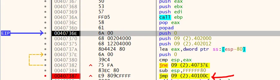 0x40100C가 OEP인데 절로 뛰기 전에 msg박스의 인자를 세팅하는걸 볼수 있다. 저기 Instruction이 stolenbytes이다.