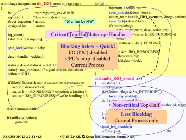 이렇게 민폐를 끼치는 영역은 주로 Critical_section 에서 발생한다. 따라서 해당 영역은 매우 신속한 처리를 필요로한다. 이러한 신속한 처리를 필요로 하는 영역을 Top-Half 영역이라고 부른다. 이는 하드웨어에 시작되는 영역이다