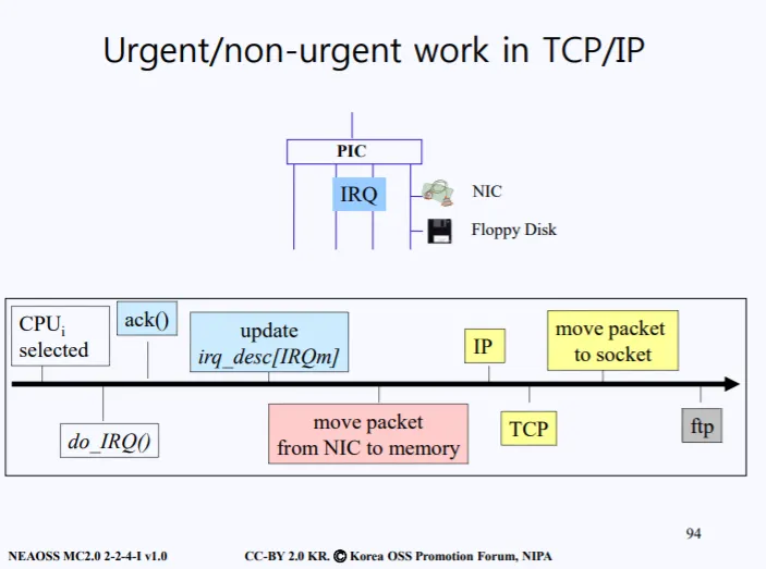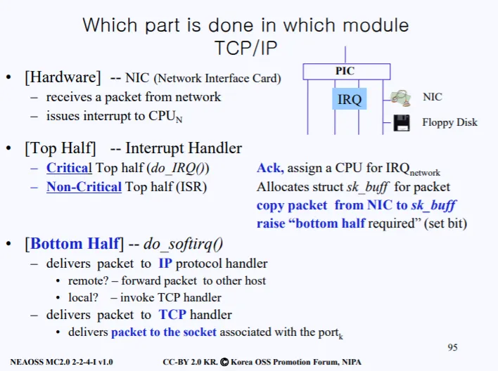 NIC로부터 요청이 오고, do_irq() 즉, 초기엔 Top-Half가 수행된다. Critical Top half가 수행되면서, ACK를 보내고, NIC의 패킷을 저장한 버퍼를 만들고, 거기에 패킷을 복사한다. 실제 패킷의 동작 처리는 bottom-half에서 진행되게끔 soft-iqr pending bit 를 세팅한다.