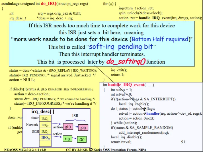 만약 현재 handle_IRQ_event() 에서 처리해야하는 작업이 디스크에서 200TB를 가져와라! 라는 요청이면 어떨까?. 매우 사이즈가 큰 작업이므로 신속한 처리를 하지 못한다. 따라서 한번에 처리하지 못하는 작업을 후에 다시 처리할수 있도록 soft-iqr pending bit 를 세팅한다.