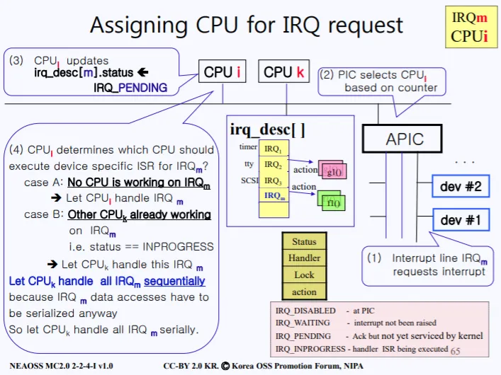 Case B : 다른 CPU(k)가 이미 IRQm을 처리하고 있으면, irq status에 Inprogress status를 추가하고, CPU(k)에게 요청을 넘긴다. ⇒ Let CPU(k) handle IRQm