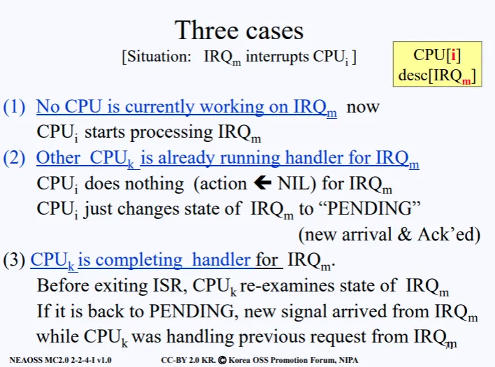 Case A : 어떠한 CPU도 IRQm을 처리하고 있지 않으면, CPU(i)가 바로 해줌. ⇒Let CPU(i) handle IRQm