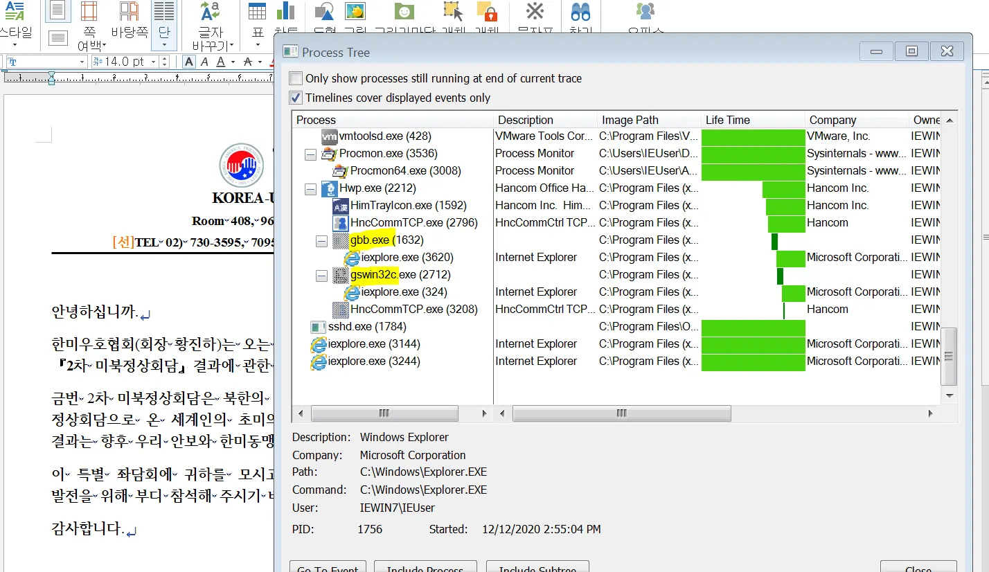 따라서 위 사진과 같이 한글 프로세스 하위에 2개의 gbb.exe, gswin32c.exe 프로세스가 실행되고 있는걸 볼수 있다. 하지만 각 프로세스의 하위에서 iexplore.exe가 injection되어 있다. 이는 사용자의 눈 보이지 않게 동작하며, 실제 악성행위는 해당 iexplore.exe 내부에서 일어날 것으로 유추된다.