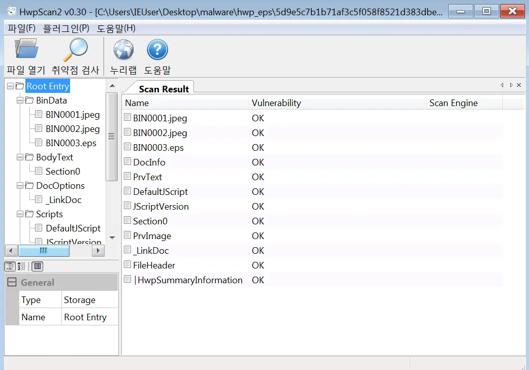 취약점 검사 기능을 이용하면 현재 검사하고 있는 한글문서에 존재하는 취약점을 확인할 수 있는데, 현재는 취약점이 발견되지 않는다. 왜냐하면 악성 PostScript 파일은 코드가 암호화가 되어있어 검사로직에 확인되지 않는다.