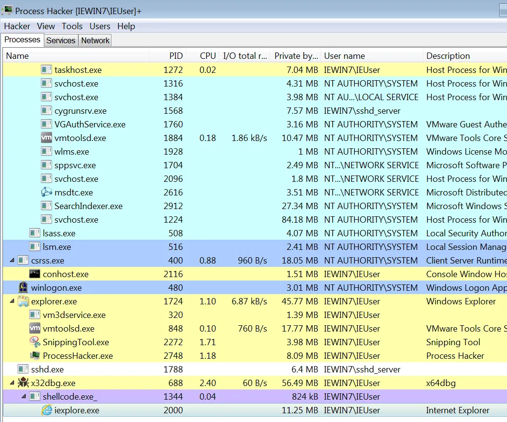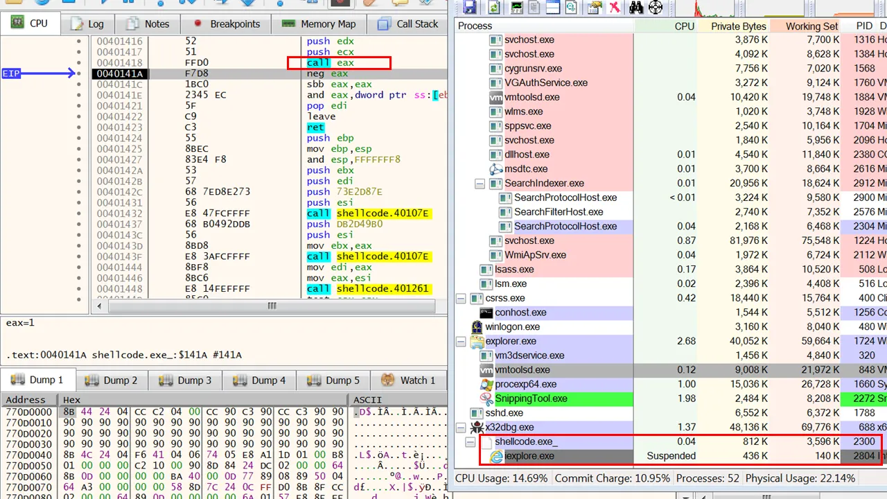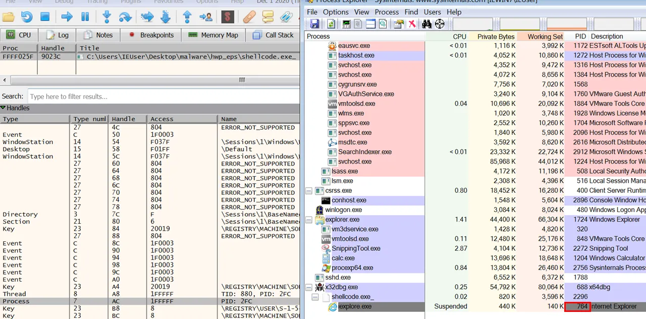 call eax 어셈이 바로 CreateProcessA()이다. 현재 호출을 완료했고, Process Explorer 프로그램을 이용해서 확인해보면 프로세스가 생성된 것을 볼 수 있다. 현재는 suspend(일시중지) 상태이다. 예상되는 악성행위로는 일시중지된 iexplore.exe에 코드를 인젝션 할 것으로 보인다. 이 부분이 어딘지를 찾아보자.
