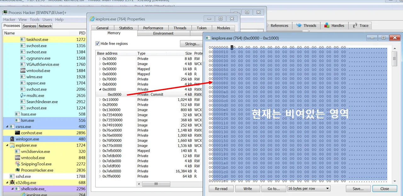 두번째 인자인 값을 쓸 주소는 VirtualAlloc으로 할당받은 주소인 0xc0000이다. RWX 권한으로 전에 할당을 받았기 때문에 WriteProcessMemory가 끝나게 되면 해당 영역으로 쉘코드가 injection 될 것이고 현재는 아무것도 들어있지 않다.