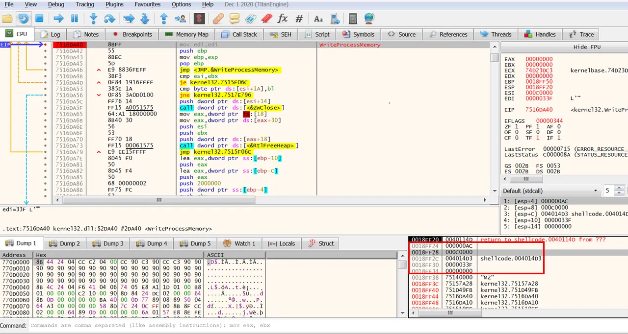 어떤 값을 쓰는지 writeProcessMemory 부터 자세히 봐보자.