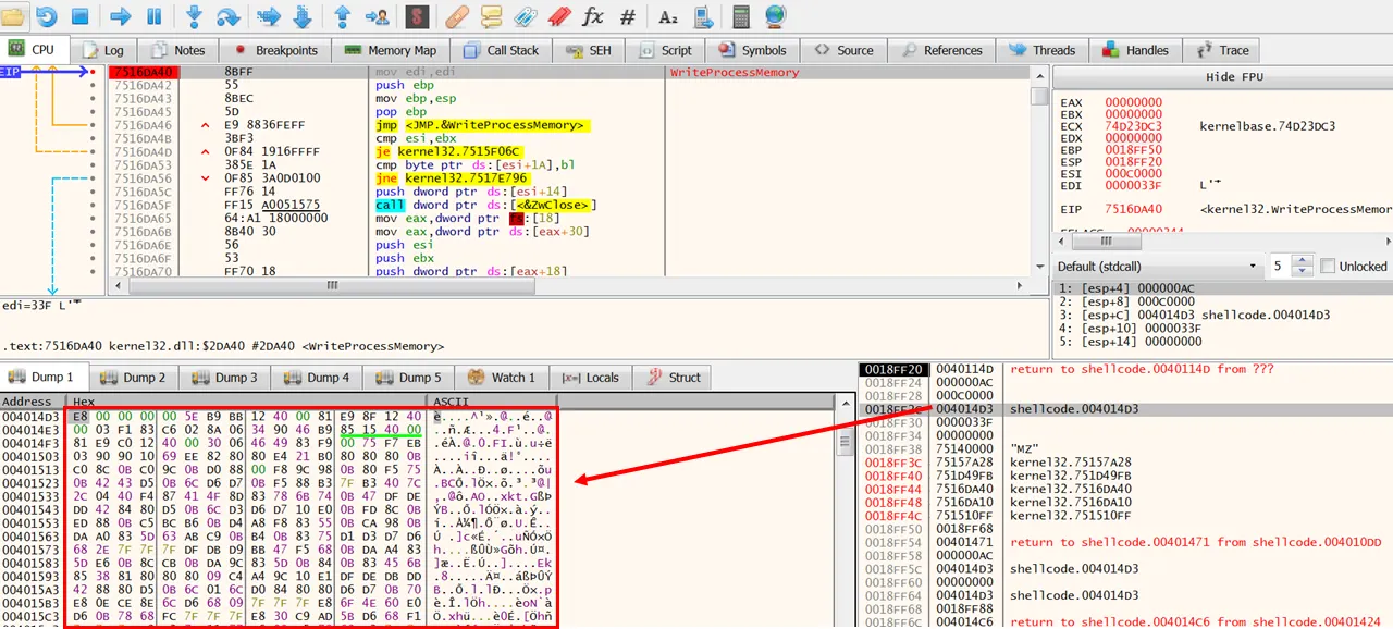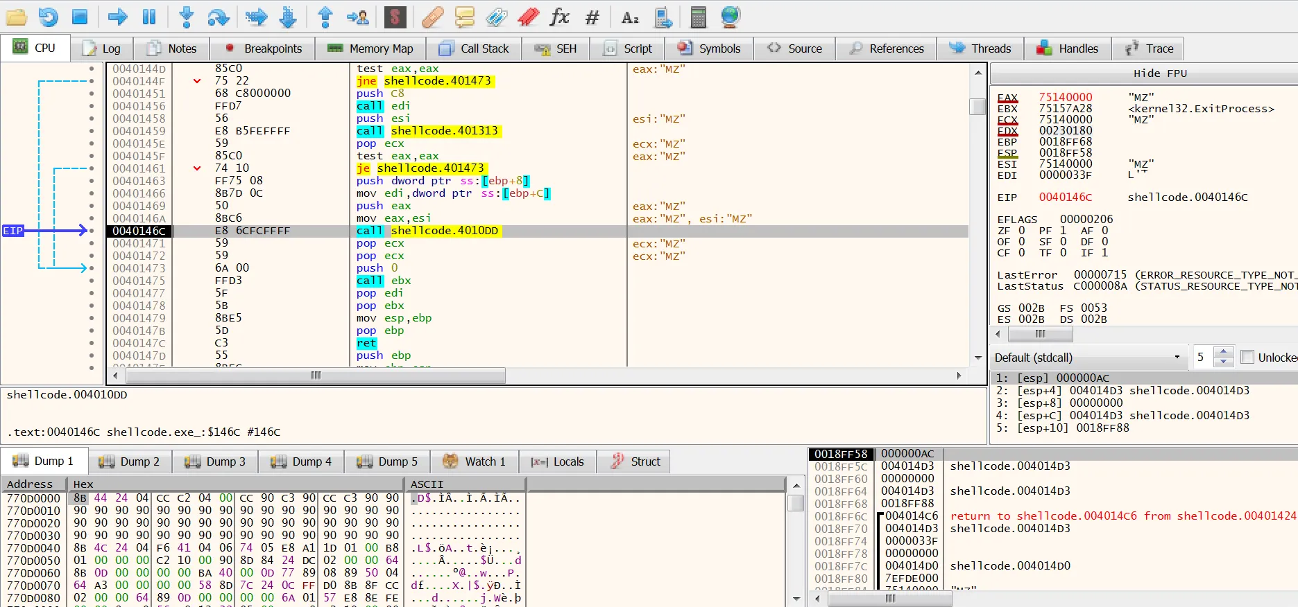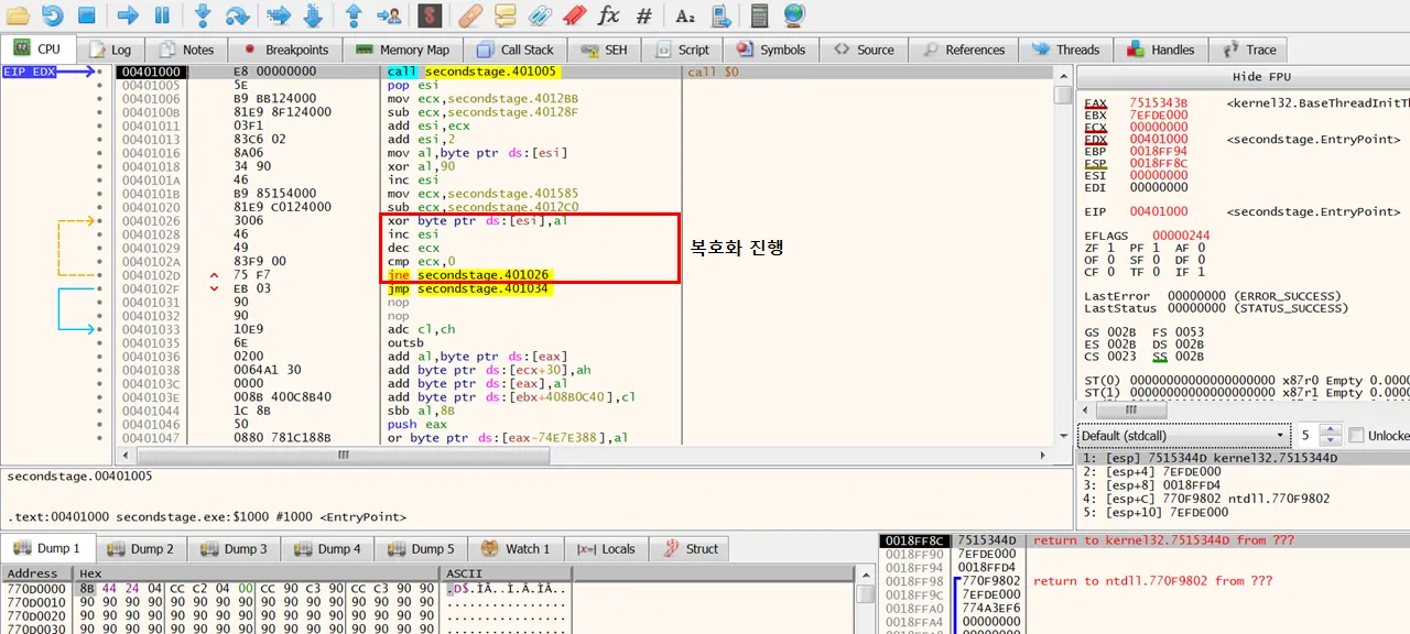 얼마지나지 않아 0x40146C 라인에서 어떤 shellcode.4010DD를 call한다. 해당 함수 내부를 확인해보자.