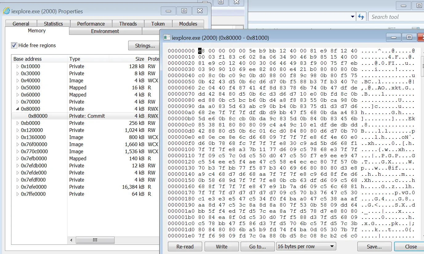 suspend 상태였던 iexplore.exe 프로세스가 CreateRemoteThread 를 통하여 실행된 것을 볼 수 있다. 따라서 실제로 어떠한 악성행위를 하는지를 알아보기 위해 Injection 된 코드를 전과 동일한 방식으로 추출하여 다시 분석을 진행해보자.