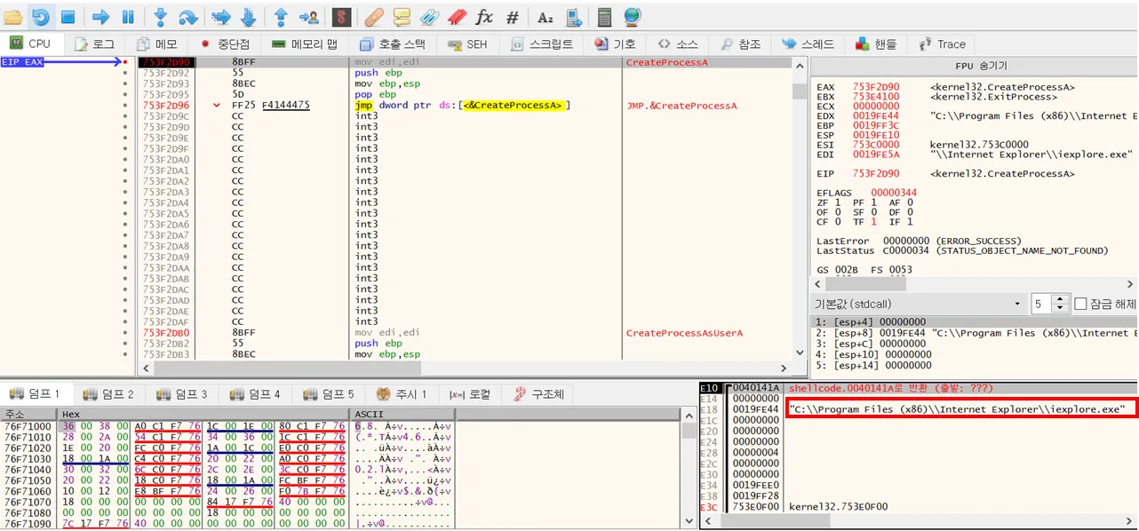 위 사진은 CreateProcessA 에 break를 걸고 실행했을 때의 결과이다. esp+8이 해당 api의 2번째 인자 위친데, 여기를 보면 iexplore.exe의 경로가 지정되어 있는것을 확인할 수 있다. 현재 위치는 dll 내부의 CreateProessA 이므로 해당 영역을 빠져나와서 다시 쉘코드 위치로 돌아가보자.