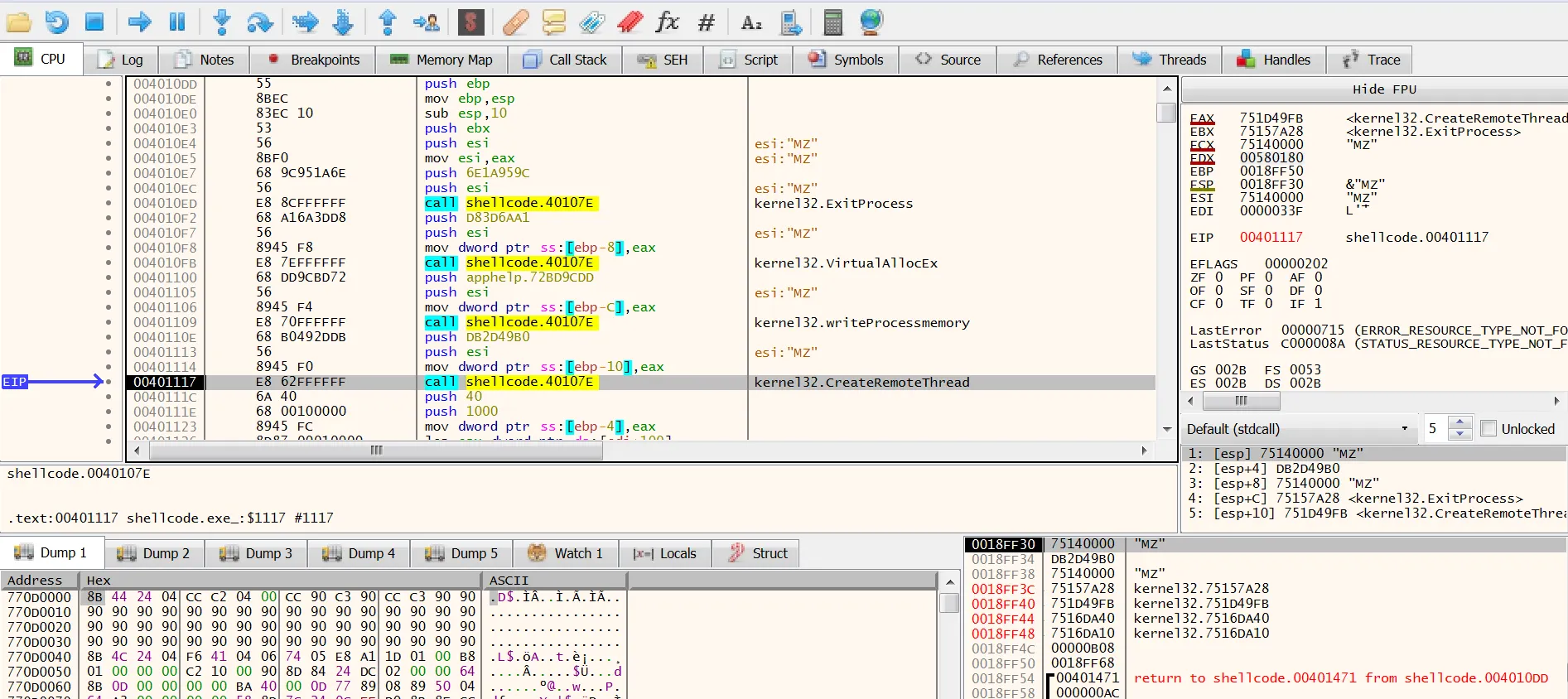 이제 삽입된 쉘코드는 CreateRemoteThread를 통하여 실제 동작이 이뤄진다.