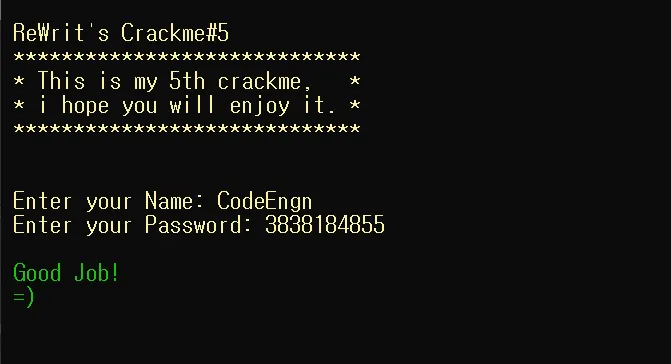 Name을 기준으로 시리얼 키 값이 생성된다. 생성로직도 간단할 뿐더더러 사실 모르더라도 동적디버깅으로 CodeEngn 이름으로 생성된 키값만 확인하여 그에 맞는 비번을 입력하면 된다