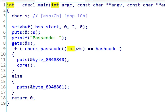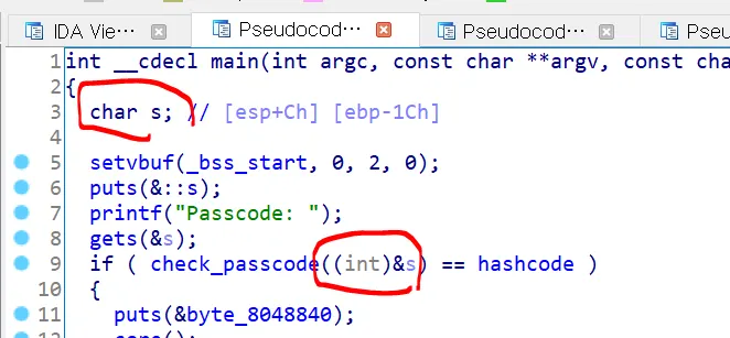 9라인을 보면 gets로 입력한 s 값을 check_pascode 함수에 넣은 값과 hashcode와 비교하는 것이 보인다