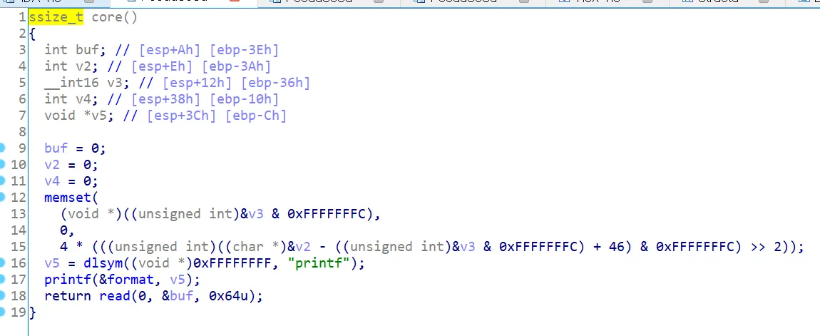 core함수는 다음과 같다. dlsym 함수를 이용하여 printf의 주소를 가져오는 코드이다. 따라서 해당 core 함수가 실행되면 printf 함수주소를 알려주게 된다. 즉 leak을 이용한 rtl 문제이다.