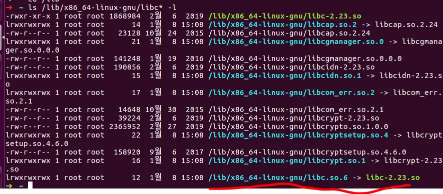 다음의 명령어를 통해 주어진 libc.so.6 파일이 결국 libc.-2.23.so 파일에 링킹되어 있다는 것을 알았다