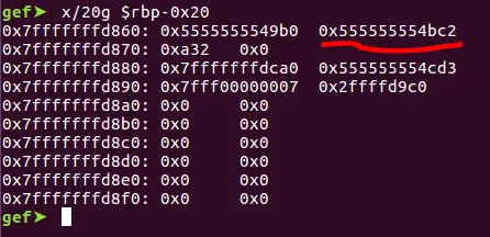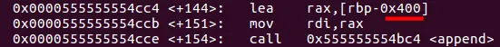 append 함수에서 선언된 buf 변수는 rbp-0x20 위치에 들어있다. buf+8 위치에 0x555555554bc2 주소가 들어가 있는데, 해당 위치는