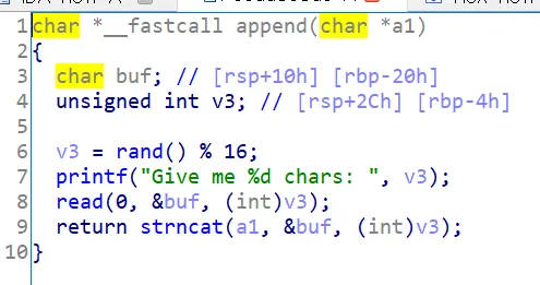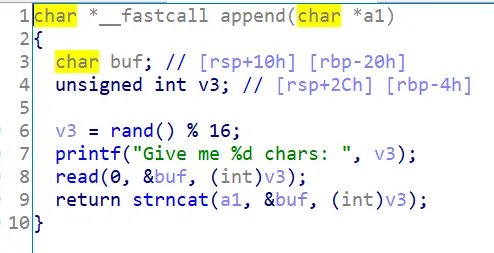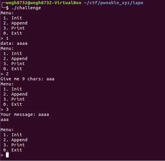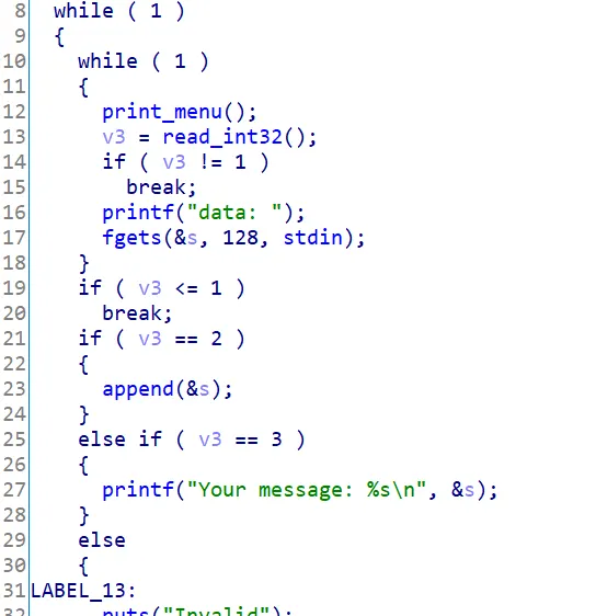 read_int32() 함수로 메뉴를 입력받는다. init 부분인 1번 메뉴를 입력하게 되면, fgets로 128바이트만큼 데이터를 입력할 수 있다. 2번 메뉴는 append함수가 들어있다. 이 함수를 다시 봐보자.