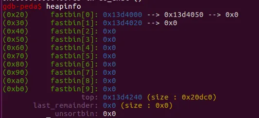 hash_gift() 함수 반환값을 0xdeadbeef로 맞춰줬다는 가정하에, 한번의 루틴을 다돌게 되면 현재 fastbin의 상황은 다음과 같다. strdup으로 선언해줬던 '@trent' , do_chat에서 입력한 s를 복사한 strdup이 free되었고, 이게 0x20 사이즈 bin에 들어가있다.