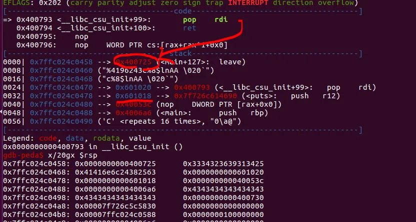 원하는대로 해당 함수의 got가 덮혀져 가젯 주소로 ret되었다. 근데, 여기서 stack을 보면 약간 이상하다. 원래대로라면 rdi에 put_got가 들어가야하는데, 현재 스택 최상단에 0x400725가 들어가있어 이 값이 rdi에 들어간다.