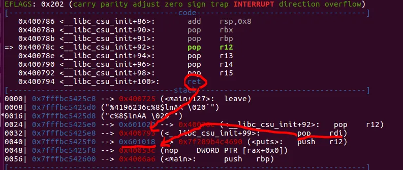 원하는 값인 0x601018은 스택에서 5번째에 위치해 있는 것을 볼수 있다. 따라서 위 시나리오의 페이로드를 전송하면 에러가 난다. 우리는 pop rdi ; ret 가젯을 이용하기 전에 스택을 먼저 맞추기 위해 pop pop pop pop ret; 가젯을 먼저 호출해야한다.
