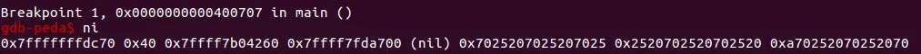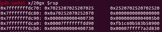 64bit 환경이기 때문에 %p 5개를 입력하고 그다음 서식문자부터 rsp의 값들을 leak할수 있다. 한번 상황을 봐보자.