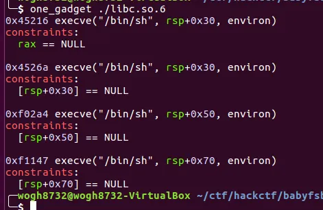 나머지 3개가 에러를 뿜는 이유를 첨에는 몰랐는데 2번째 인자에 execve를 이용하여 쉘을 얻으려면 2,3번째 인자가 널이여야한다. 따라서 rsp+0x30, rsp+0x50, rsp+0x70 이 3개는 해당 one gadget이 호출되었을때 널이 아니여서 execve가 제대로 동작하지 않은 것이다.