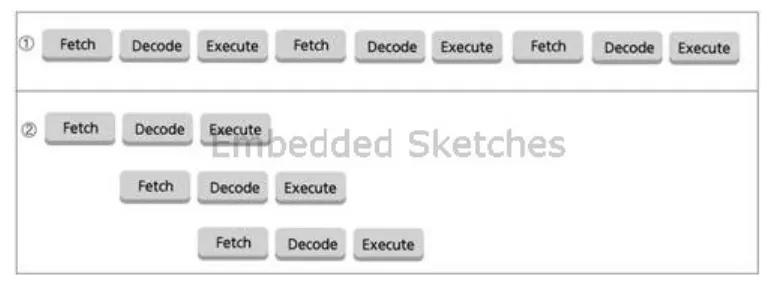 fetch ⇒ decode ⇒ execute ⇒ fetch ⇒decode ⇒ execute 이렇게 총 6단계의 로직이 수행된다. 기본적인 3단계 사이클의 성능을 향상시키기 위해 파이프라이닝을 적용시켜 병렬적으로 명령어를 수행할 수가 있다.
